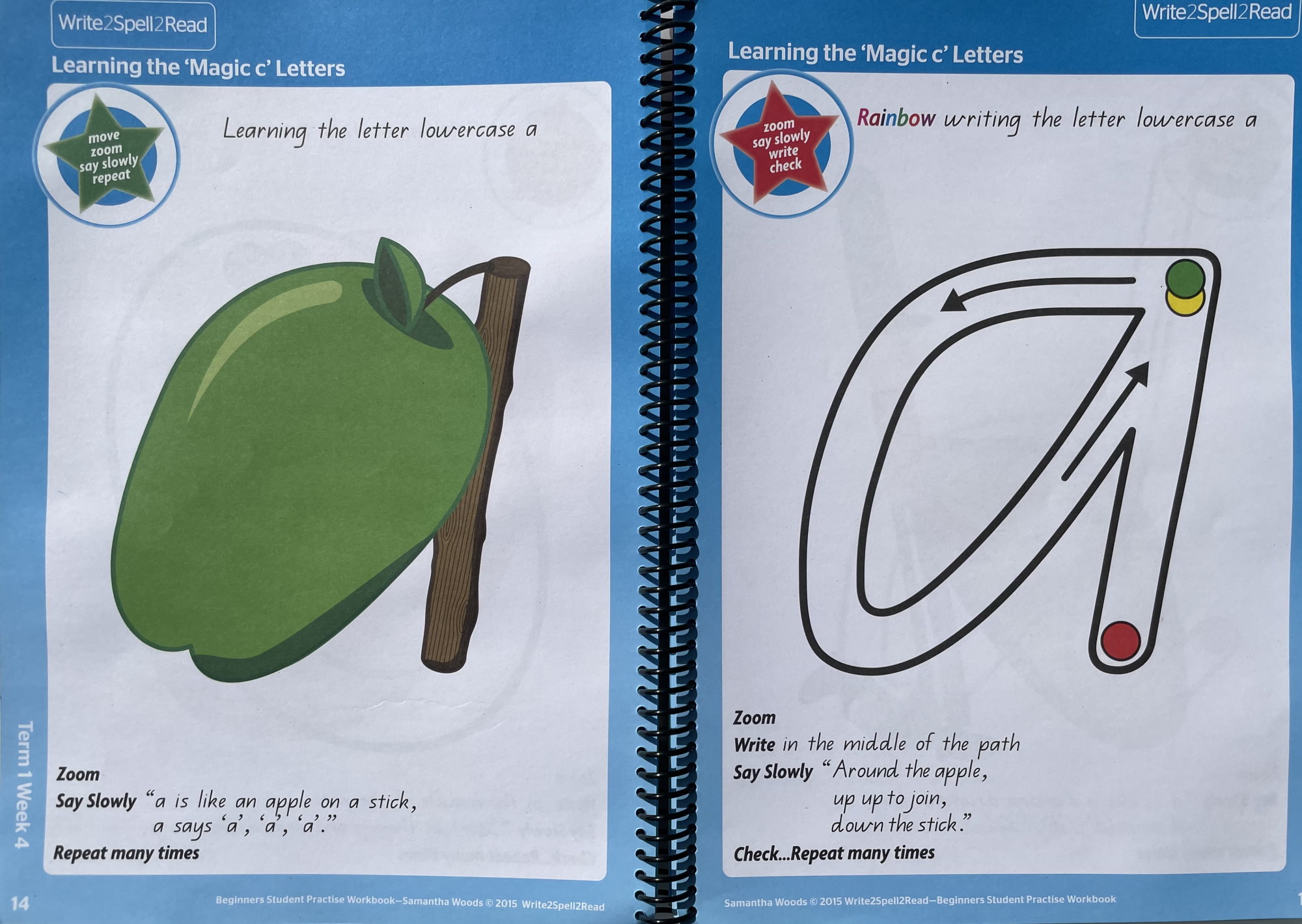 Perfect for first learners, this colourful Student Practice Workbook teaches at the same time, the name, sound, and how to write lowercase and capital letters, and numbers 1 – 20. The spiral bound book opens flat to show on the left a large picture that mimics the letter shape and starts with the same sound as the letter on the right. Number pictures also mimic the shape of the numbers to 20. A large Tracking Letter or Number is drawn with wide double lines for large writing practice. ‘Writing Talk’ said by the teacher and student as they write and traffic light cues guide correct writing direction and letter formation, without reversals.